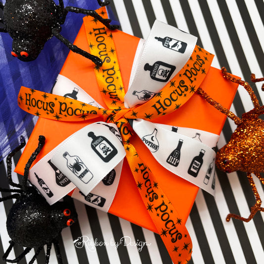 Hocus Pocus ribbon with black ink printed on 5/8" tangerine single face satin