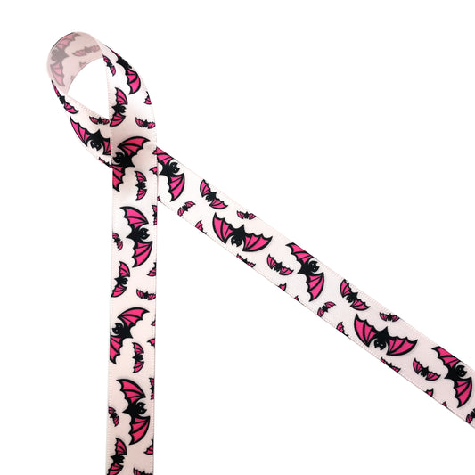 Black bat ribbon for Halloween black bats with hot pink wings printed on 5/8" light orchid or light pink satin
