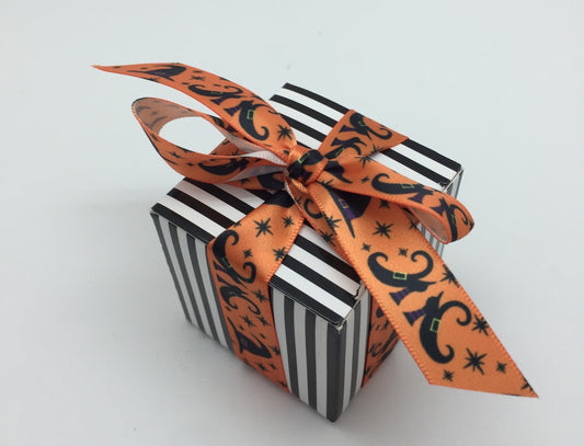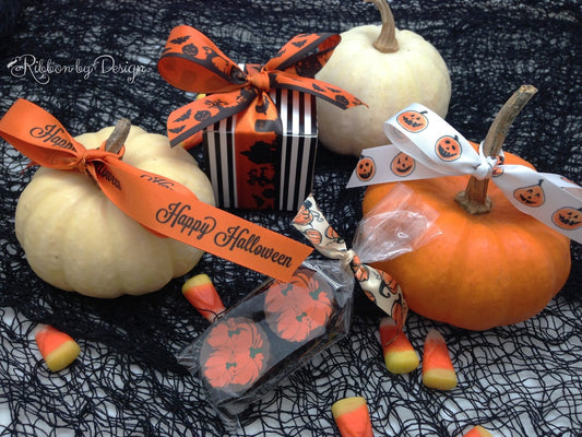 Halloween is so much fun! We have ghosts and goblins, spooky towns and trick or treat ribbons to add some fun to all the costume parties and treat bags. In addition to the traditional themes and colors, we have added some Halloween elegance too. Lots of couple choose Halloween for their wedding theme and we have some wonderful classic patterns in Halloween colors. No matter the event, we can add some charm to your Halloween!
