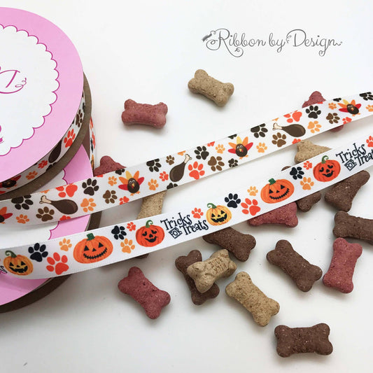 Tricks for Treats ribbon with paw prints and Jack O' Lanterns for pets printed on 5/8" white single face satin