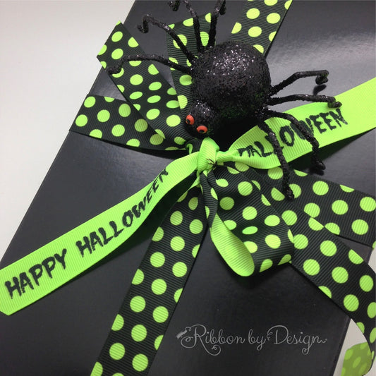 Happy Halloween Ribbon in black ink on 7/8" Neon Green grosgrain ribbon