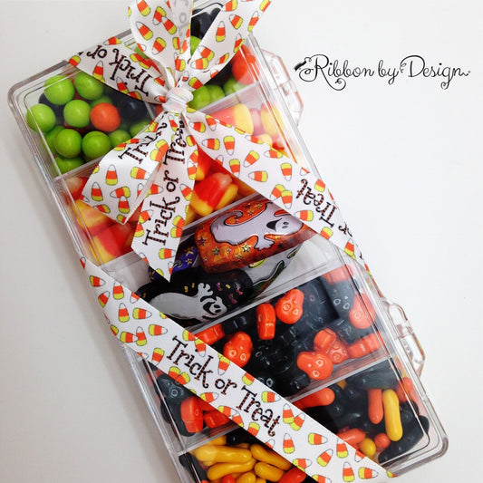 Trick or Treat Ribbon with candy corn on 5/8" white single face satin ribbon