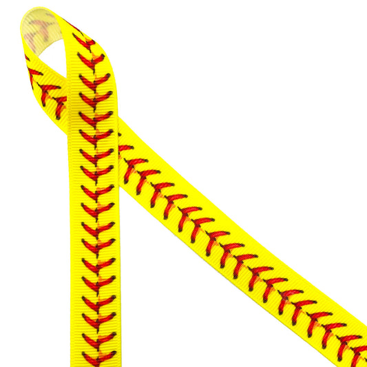 Softball ribbon red softball stitches on a bright yellow background printed on 5/8" white grosgrain and satin
