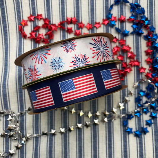 Patriotic ribbon with fireworks in red, white and blue for 4th ofJuly printed on 7/8" white satin