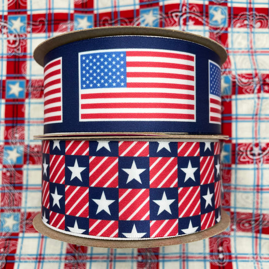 Patriotic ribbon with stars and stripes for 4th of July printed on 1.5" white satin