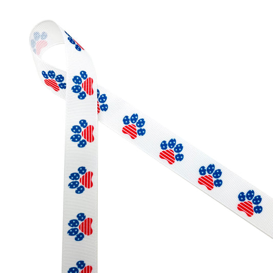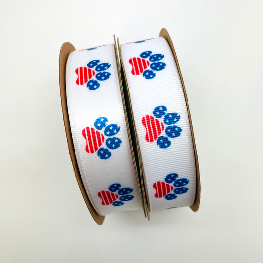 Patriotic paw print ribbon in red white and blue printed on 7/8" white grosgrain and Satin