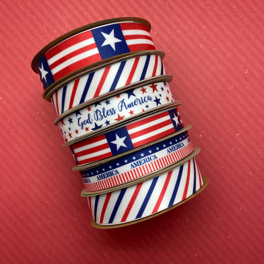 Patriotic stripe ribbon red, white and blue printed on 7/8" satin