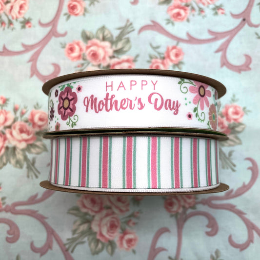 Happy Mother's Day ribbon pink floral printed on 7/8" white satin
