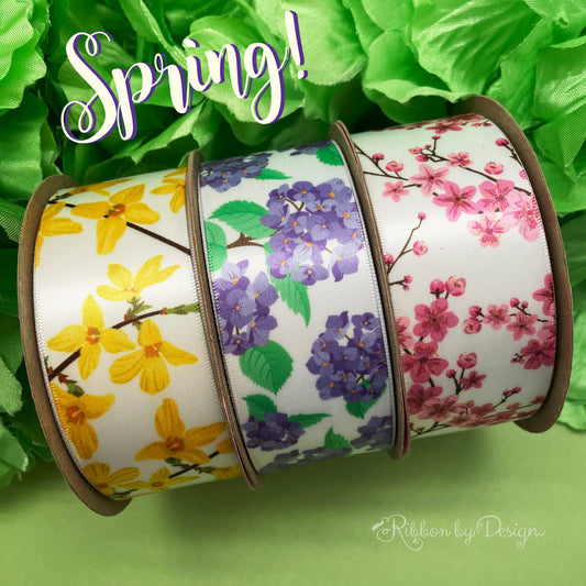 Forsythia ribbon ideal for Spring printed on 1.5" white satin