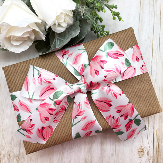 Pink Magnolia ribbon magnolia blossoms printed on 1.5 white satin