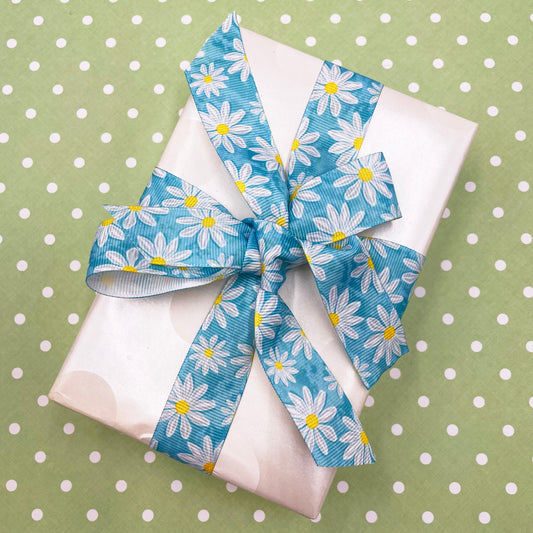 Daisy ribbon daisy blossoms on a watercolor blue background printed on 7/8" grosgrain