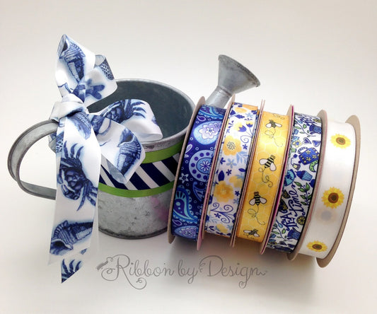 Floral ribbon blue and yellow for Mother's Day, bridal shower, gift wrap, party favors, party decor, cookies, printed on 5/8" white satin