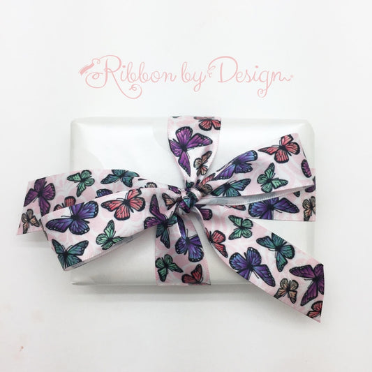 Butterflies and Flowers Ribbon in pink, blue and green on 5/8" white single face satin