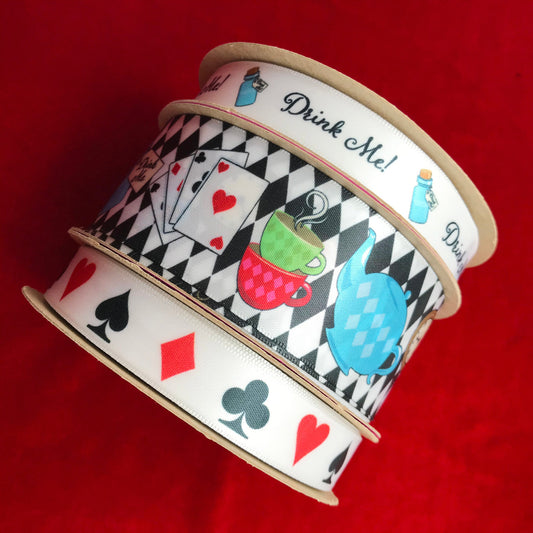 Alice in Wonderland ribbon with all the elements of her story on a black and white harlequin background printed on 1.5" white single face satin