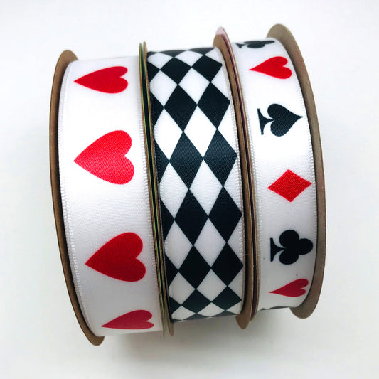 Playing Card suits ribbon printed on 5/8" white single face satin ribbon