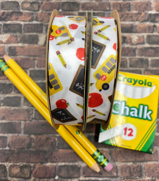 School Ribbon with chalkboards, pencils, apples and busses printed on 5/8" and 7/8" white satin