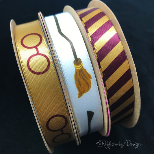 Wizard stripes ribbon in Burgundy and Gold printed on 5/8" Dijon gold satin