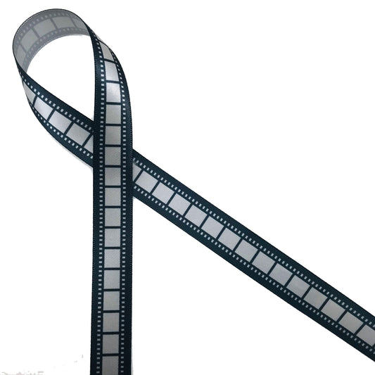 Movie Film Strip ribbon for, Vintage film, Movie Party, Movie night, gift wrap, Hollywood in black printed on 7/8" silver satin