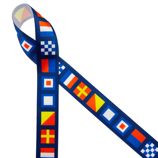 Nautical Flag ribbon flags spell NEWPORT with a navy blue background printed on 7/8" white satin and grosgrain