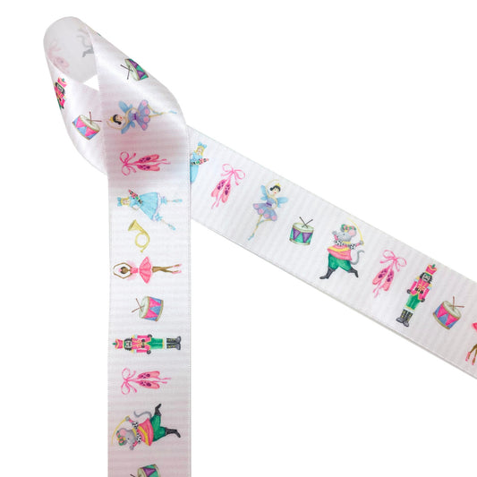 Nutcracker Ballet ribbon featuring all the characters printed on 5/8", 7/8" and 1.5" white satin
