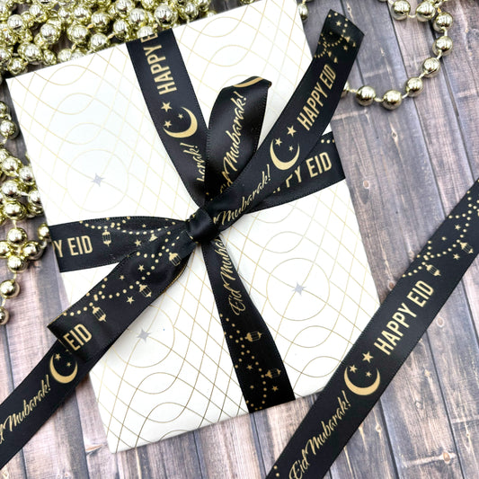 Happy Eid, Eid Mubarak ribbon in gold with a crescent moon and lanterns on a black background printed on 5/8" dijon gold satin