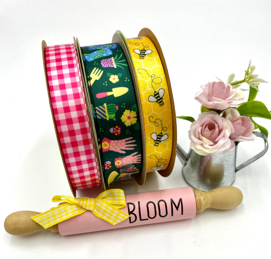 Gardening ribbon featuring plants, flowers, boots, hats, gloves and tools on a dark green background printed on 7/8" white satin