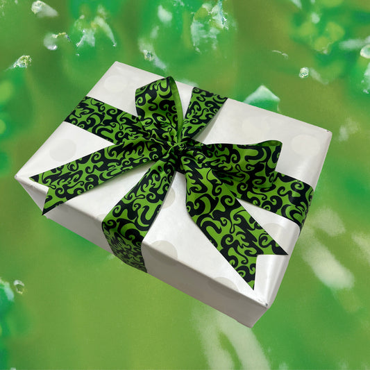 Green Witch ribbon with black swirls for a wicked fun movie party, gift wrap, party decor, sewing and quilting printed on 1.5" white satin