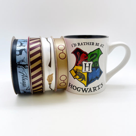 Wizard glasses ribbon in burgundy print on 5/8" dijon gold single face satin