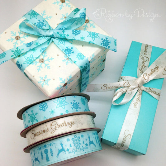 Snowflakes Ribbon in blue on 5/8" Ice Blue Single Face Satin Ribbon