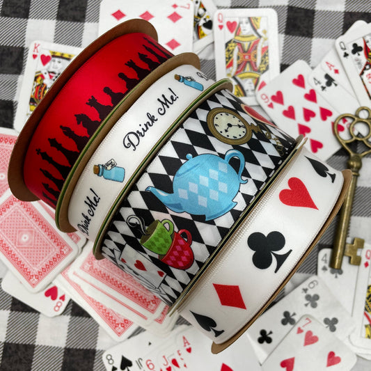 Alice in Wonderland blue "Drink Me" bottle ribbon with black text printed on 5/8" white single face satin