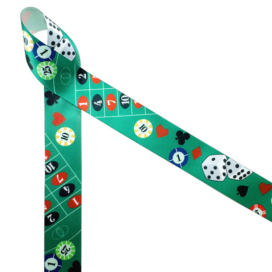 Casino Theme Ribbon with chips, dice, playing card suites and table games on a green background printed on 5/8" and 7/8" white satin