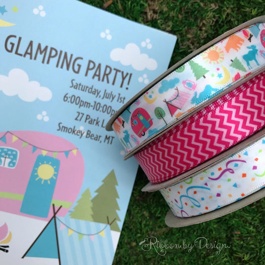 Camping ribbon with tents and campers for parties, gift wrap, party decor, party favors, quilting, crafts, printed on 5/8" white satin