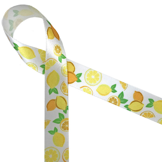 Lemons ribbon yellow lemons cut and whole with leaves printed on 5/8:" and 7/8" white single face satin