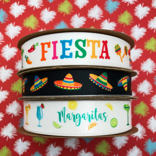 Fiesta Ribbon for Southwestern and Cinco De Mayo themes printed on 7/8" and 1.5" white satin, 10 yards