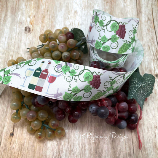 Wine ribbon with wine bottles, glasses, vines and grapes printed on 1.5" white satin