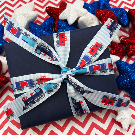Train ribbon train cars in a blue and white stripe background printed on 5/8" white satin