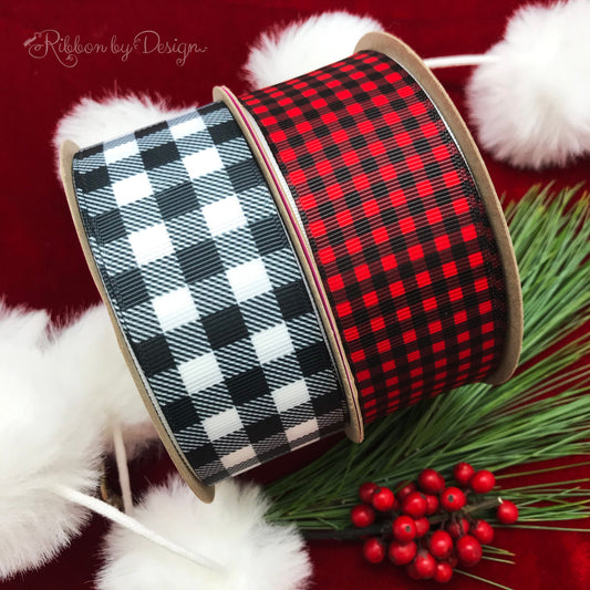 Buffalo Plaid ribbon in black on 1.5" red grosgrain