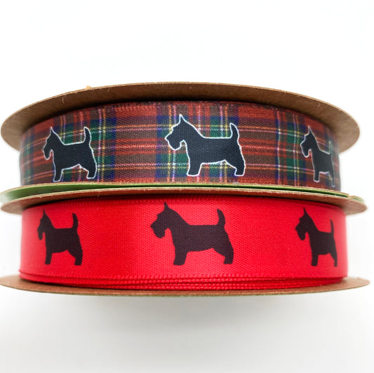 Scottie Dog ribbon on a tartan plaid background printed on 5/8" white single face satin