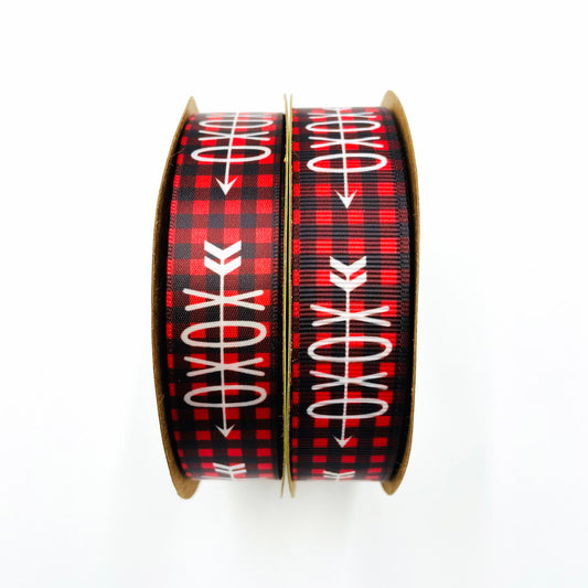 Valentine X's and O's in white on a red and black buffalo plaid background printed on 7/8" white grosgrain