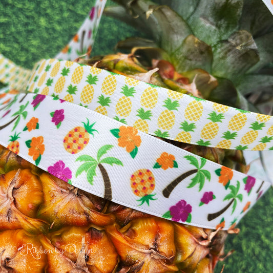 Pineapple Ribbon, Yellow and Green on 5/8" white single face satin