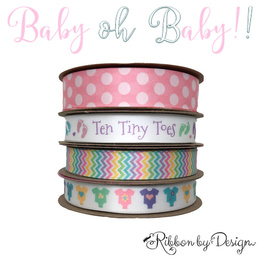 Ten Tiny Toes Ribbon with pastel footprints 5/8" White Single Face Satin Ribbon
