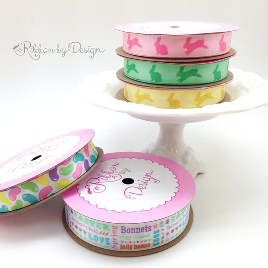 Bunnies Ribbon in green hopping on 5/8" Mint Green single face satin ribbon