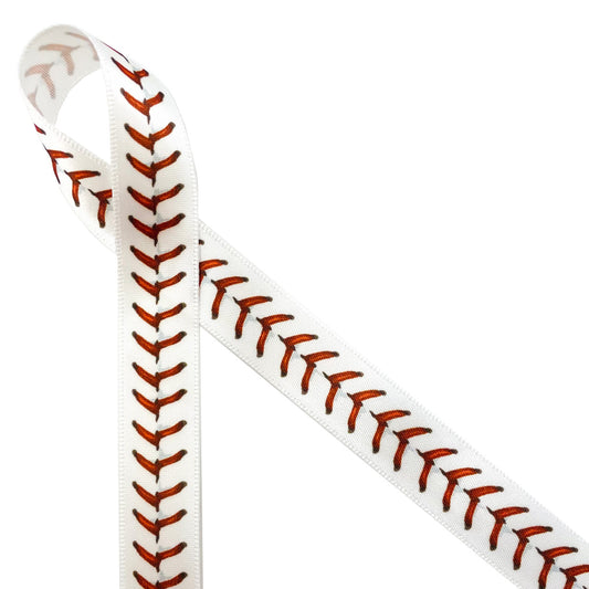 Baseball ribbon red baseball stitching printed on 5/8" and 7/8" white single face satin
