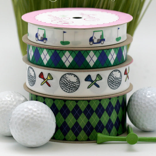 Golf theme ribbon with carts and clubs in Green and Blue printed on 5/8" white single face satin
