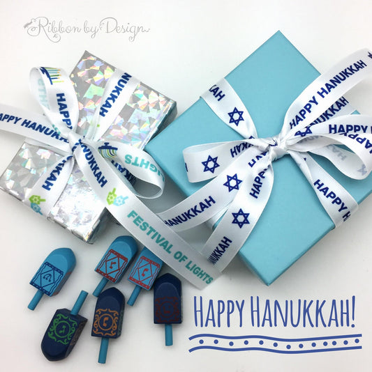 Happy Hanukkah Ribbon Festival of Lights with Menorrah in blue on 5/8" White Single Face Satin Ribbon