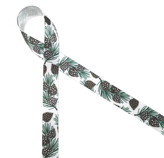 Pine cones ribbon with branches and needles on a white background printed on 5/8" white single face satin