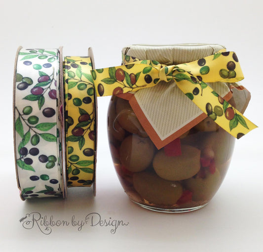 Olives Ribbon in Dark purple and green olives printed on 5/8" Daffodil yellow single face satin