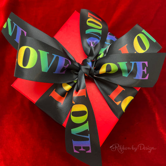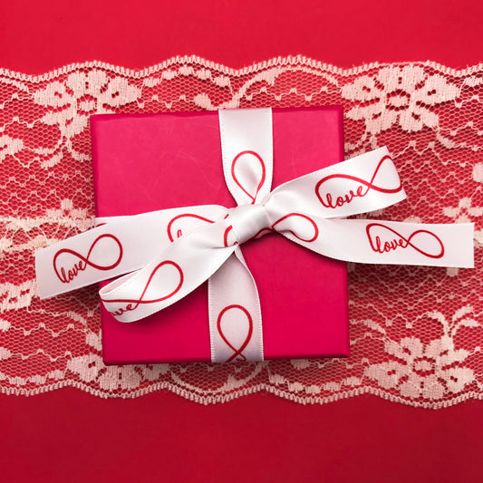 Infinity Love Loop Valentine ribbon in red text printed on 5/8" white satin