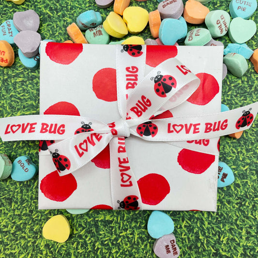 Valentine ribbon Love Bug with lady bug printed on 5/8" white satin