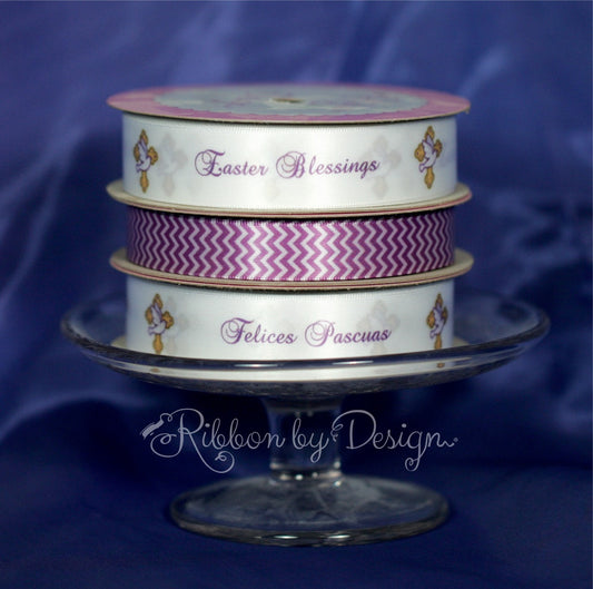 Felices Pascuas Ribbon with a Cross and Dove on 7/8" White Single Face Satin